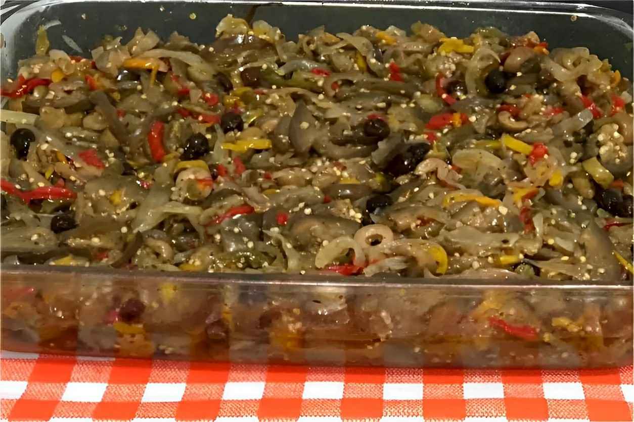 Para preparar o antepasto de berinjela, higienizaremos as berinjelas, cortando-as em rodelas finas, amontoando-as, dividindo-as em 4 partes e colocando-as em uma vasilha com água, sal e vinagre, mantendo-as de molho. Higienizaremos os pimentões, vamos eliminar as sementes e fatiá-los em tiras finas, deixando reservado. Vamos tirar as cascas e picar as cebolas em tiras finas. Depois de tudo cortado, seguiremos o passo a passo para a continuação e finalização da receita. Agora você já pode servir e saborear o seu magnífico antepasto de berinjela!