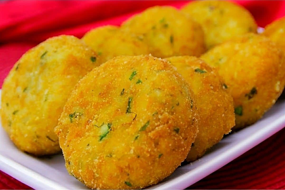 Bolinho de batata recheado com queijo e usando também o arroz que sobrou de ontem