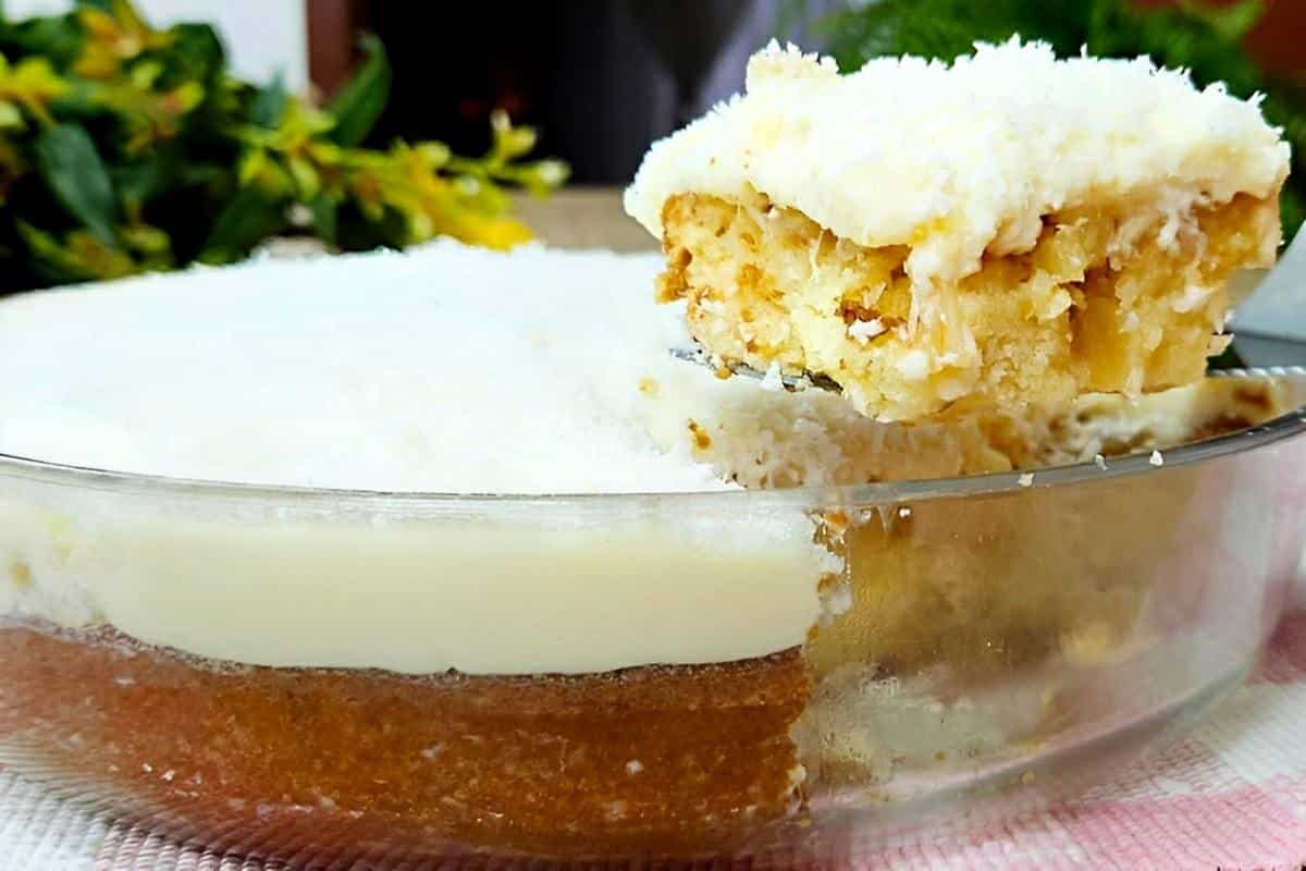 Bolo gelado de abacaxi na travessa muito molhadinho e saboroso para a sua sobremesa