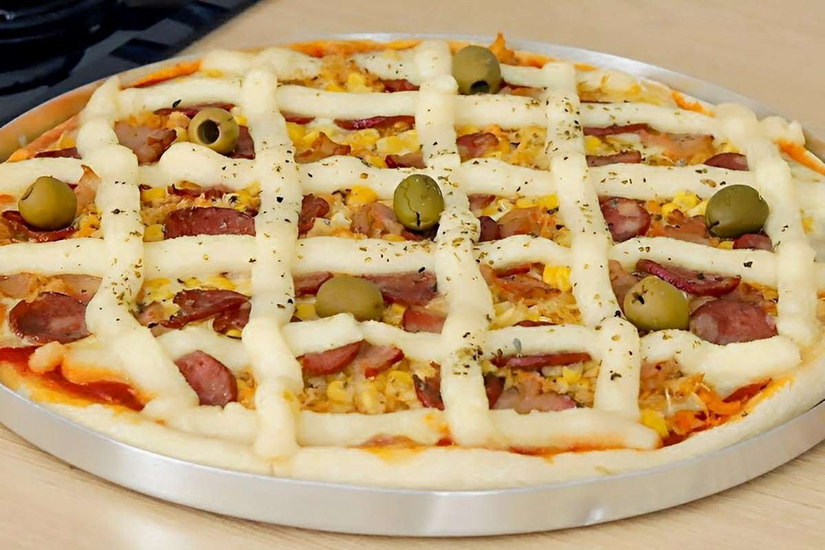 Para fazer essa pizza caseira vamos usar ingredientes que talvez você já possua na sua despensa como, farinha de trigo, fermento biológico, açúcar, azeite, sal, água, molho de tomate, queijo muçarela, frango, milho, bacon, calabresa, azeitonas e requeijão. Para fazer essa pizza caseira, vamos começar montando os ingredientes na tigela. Colocamos a farinha e, fazendo um buraco no centro, adicionamos o fermento, o açúcar e o azeite. Em volta adicionamos o sal e começamos a colocar a água morna no centro, misturando com as mãos. Depois de sovarmos essa massa por cerca de 10 minutos, separamos em dois pedaços e deixamos a massa descansar por 1 hora. Abrimos cada massa no formato de pizza, dobrando as laterais para ajeitar o formato e fazer a borda. Acomodamos as massas nas formas e recheamos para levar ao forno pré-aquecido a 220 graus por cerca de 20 minutos. E nossa pizza caseira está pronta! Sirva e saboreie essa delícia.