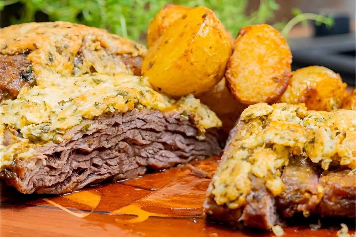 Primeiro passo é preparar uma pastinha de tempero, sal, manteiga, alho, páprica defumada, salsinha e pimenta do reino, mexa bem. Em seguida acomode a peça de fraldinha na assadeira, passe a pastinha de tempero bem passado pelos dois lados. Deixe descansando no mínimo por 3 horas para penetrar o sabor. Cubra com papel alumínio, coloque para assar em forno pré-aquecido a 200°C por 40 minutos. Após o tempo abra e adicione as batatas cortadas ao meio, deixar assando por mais 40 minutos, Faça uma farofinha com o queijo parmesão, manteiga e salsinha, retire a carne do forno e coloque a farofa por cima da fraldinha e espalhe bem, leve novamente para o forno por mais 15 minutos. Tudo pronto para servir essa deliciosa fraldinha assada. Confira o passo a passo e a lista de ingredientes.