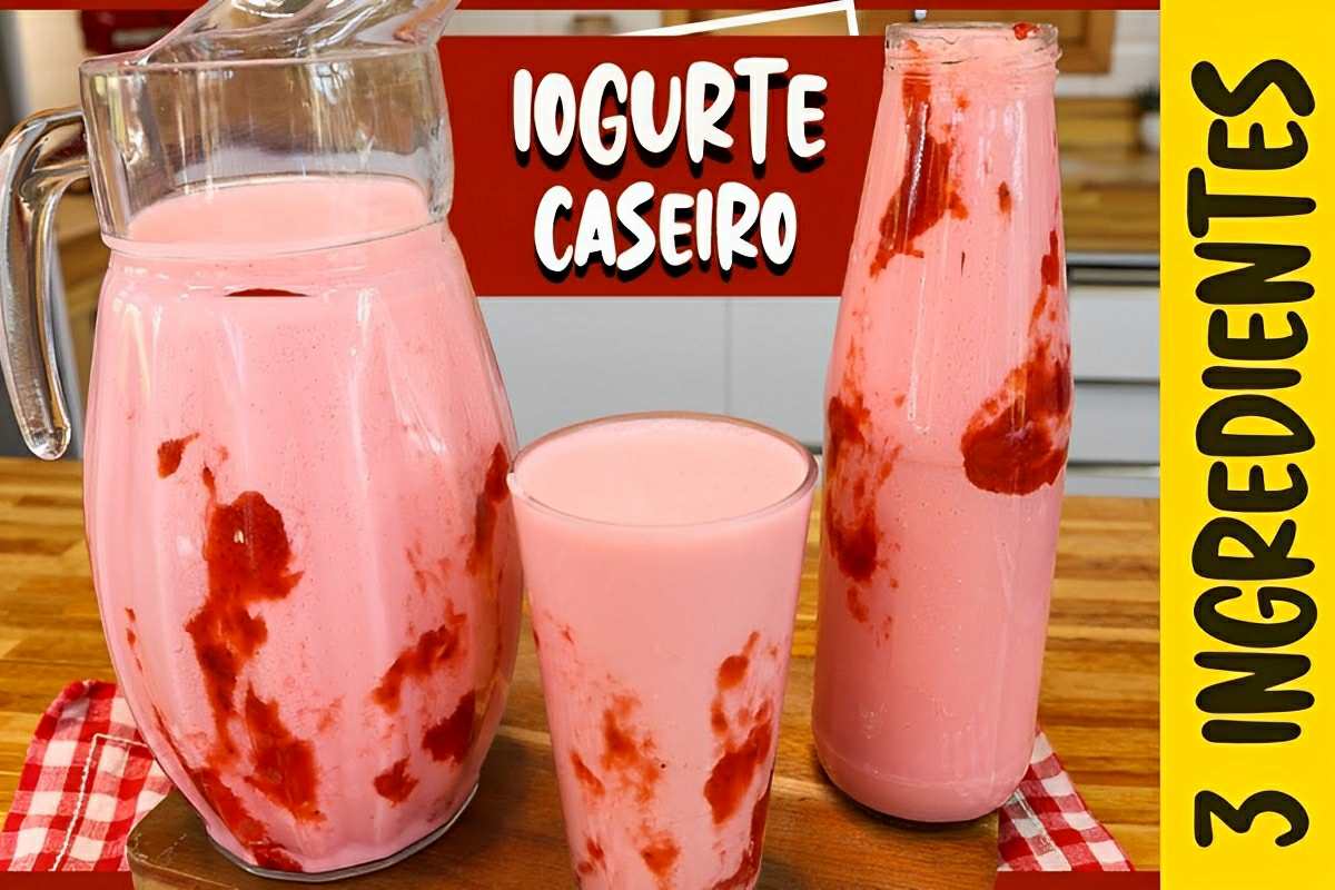 Para fazer iogurte caseiro vamos precisar de iogurte natural integral e leite. Iremos primeiramente, colocar metade do leite numa panela e levar ao fogo médio até iniciar fervura. Na sequência do preparo do iogurte caseiro, iremos retirar do fogo, dispor numa travessa e acrescentar o restante do leite em temperatura ambiente e o iogurte natural. Para dar continuidade no preparo do iogurte iremos seguir corretamente a sequência do passo a passo para que o resultado seja impecável. Em seguida, depois do descanso e do tempo de geladeira, vamos bater no liquidificador, o iogurte com o suco em pó de morango, até homogeneizar, transferir para uma jarra e saborear esse delicioso iogurte caseiro!