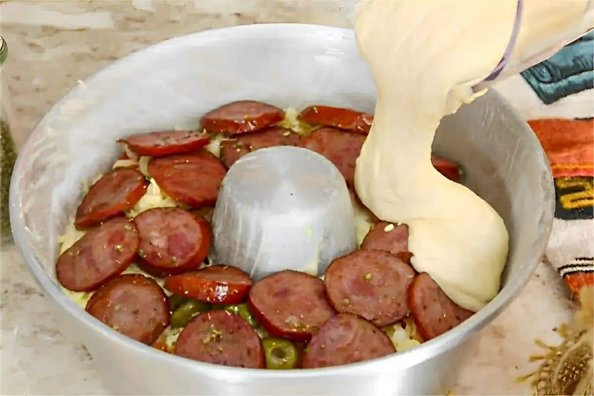 Para prepararmos o lanche de forno, primeiramente, vamos dourar a calabresa em um fio de azeite e reservar. Em seguida, no liquidificador, vamos misturar os ingredientes da massa, até obter uma massa homogênea. Na sequência, em uma forma de furo central já untada e polvilhada com farinha, vamos intercalar camadas de massa e recheio, conforme as instruções do passo a passo. Iremos finalizar com a muçarela ralada, e assar em forno pré-aquecido a 180°C por uns 35-40 minutos. Iremos retirar do forno, aguardar amornar um pouco, desenformar, servir e saborear seu delicioso lanche de forno!