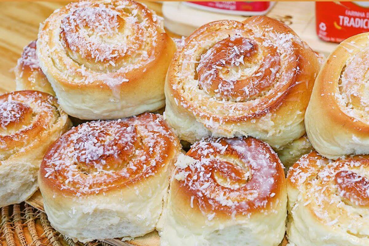 Pão de leite recheado com coco e leite condensado é de comer rezando de tão gostoso