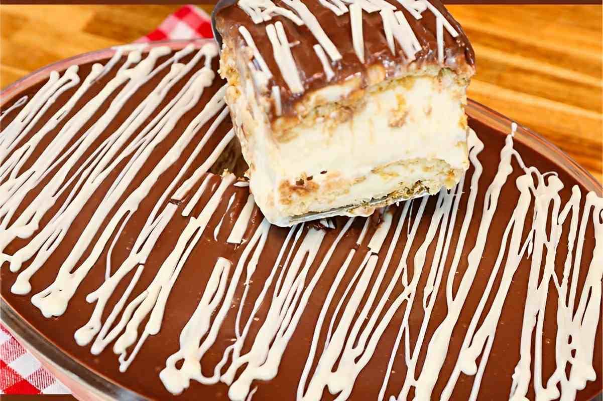 Para fazer pavê de nata vamos precisar de leite condensado e nata. Primeiramente iremos bater a nata na batedeira por apenas 30 segundos, acrescentar o leite condensado e misturar levemente para incorporar. Na sequência do preparo do pavê de nata vamos intercalar numa travessa, camadas de creme com camadas de biscoito maisena umedecido no leite. A última camada deverá ser de creme. Depois disso iremos cobrir com a ganache feita conforme as orientações, gelar o pavê de nata até o dia seguinte, retirar da geladeira, decorar com linhas de chocolate branco e servir em seguida bem gelado essa delícia de pavê de nata!