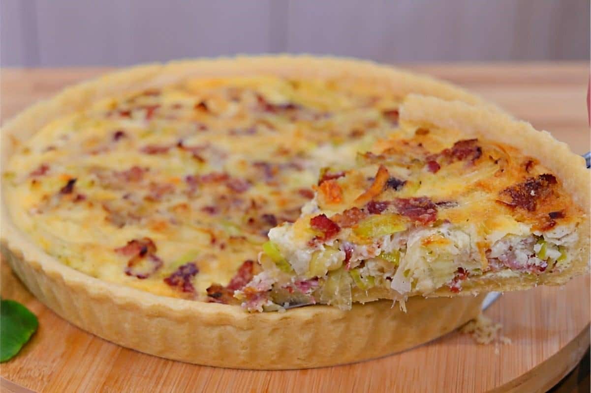 Quiche de bacon com alho poró e queijo com uma massa sequinha que derrete na boca