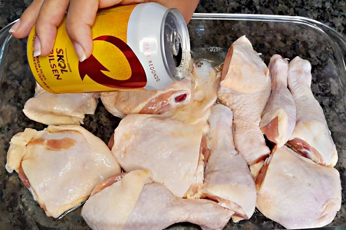 Para a receita de frango de restaurante, primeiramente higienizaremos o frango e então vamos dispor os pedaços num refratário de vidro. Por cima deles, despejaremos 1 lata de cerveja e distribuiremos o creme de cebola em pó. Salpicaremos páprica picante, coentro moído, curry e sal. Acrescentaremos também o suco de limão e vamos mexer com as mãos para pegar os temperos. Untaremos com azeite uma assadeira retangular grande, colocaremos os pedaços de frango nela e vamos assar em forno pré-aquecido a 200°C durante 50 minutos. Tire, sirva e aproveite sua maravilhosa receita de frango de restaurante! Bom apetite!