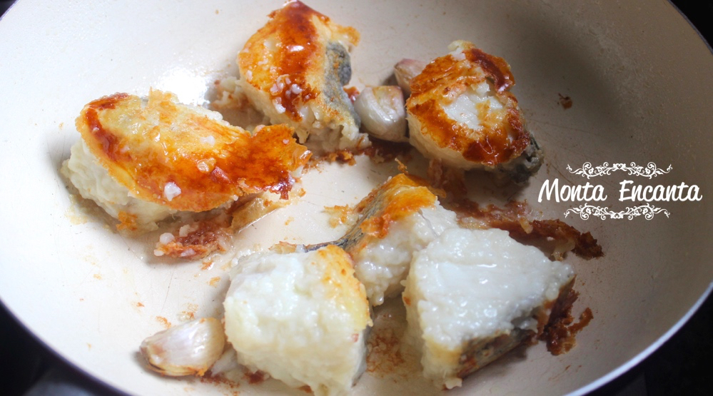 Em seguida coloque as postas dessalgadas e empanadas na farinha de trigo.