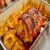 Tire o lombo, coloque o vinho na assadeira ainda quente, a água e solte o fundo, Coe e sirva com o lombo e os legumes.