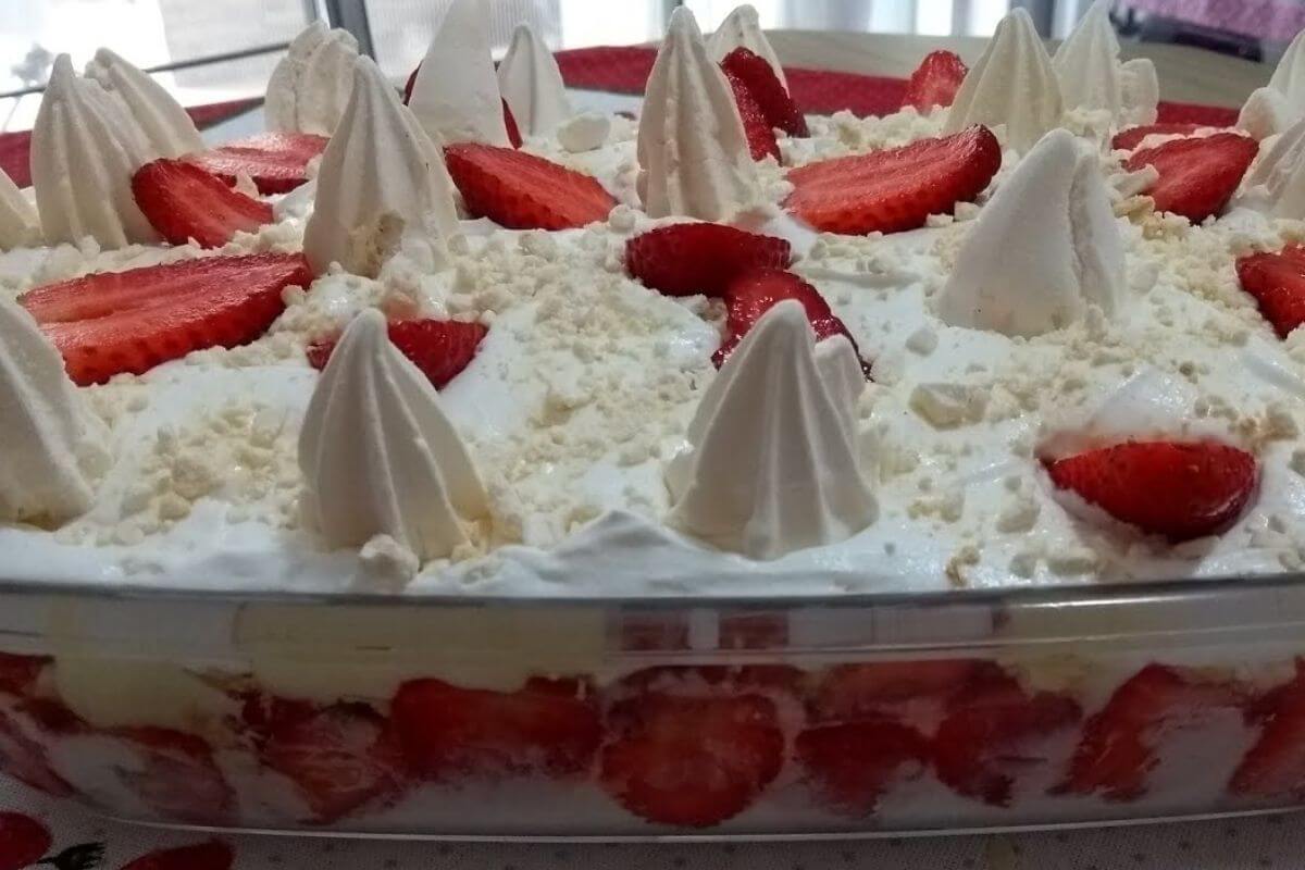 Para fazer esse merengue de morango, precisaremos de amido de milho, leite, ovo, leite condensado, creme de leite, essência de baunilha, creme de leite para chantilly, morango, e suspiro. O modo de preparo desse merengue de morango é muito simples! Primeiro, preparamos o creme de confeiteiro em uma panela, reservando para esfriar em seguida. Em uma batedeira, batemos o creme de leite até virar chantilly. Em um refratário, colocamos camadas de chantilly, creme, morango, suspiro, creme e chantilly. Decoramos com suspiro e morango e levamos à geladeira para servir essa delícia bem gelada!