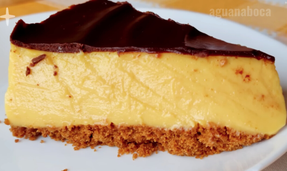 Para o creme do pudim, é necessário aquecer 1 litro de leite com 2 pacotes de pudim, 2 colheres e meia de amido de milho e 200g de doce de leite, mexendo sempre até engrossar. Esta mistura deve ser despejada em cima da base de bolacha e guardada na geladeira por uma hora.