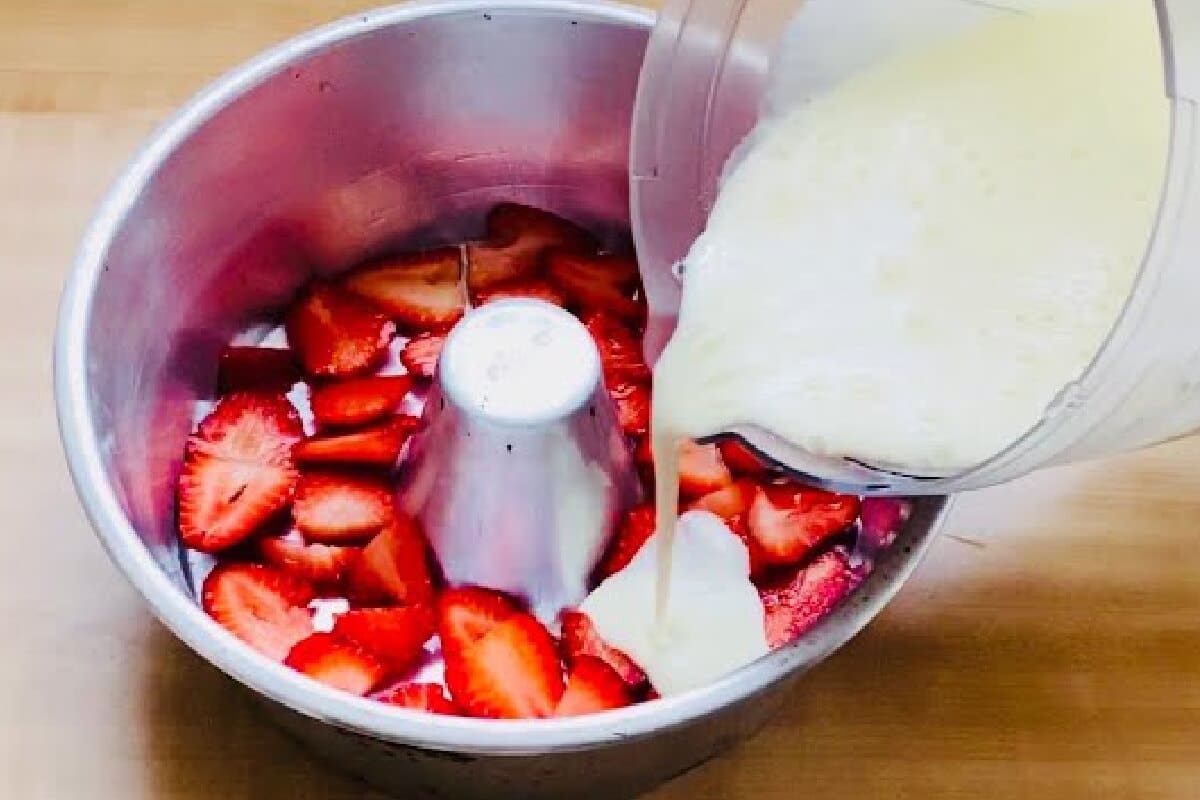 4. Despeje, cuidadosamente, a mistura batida do liquidificador, por cima dos morangos.