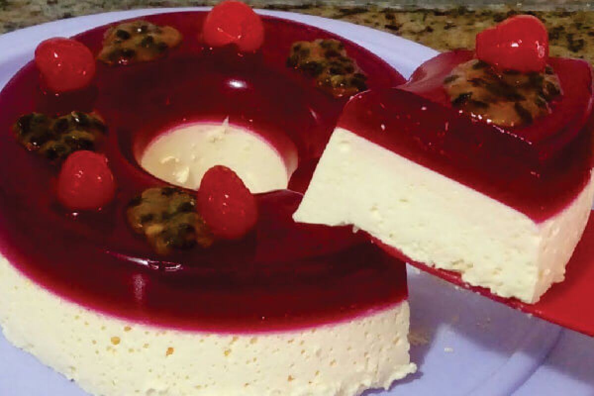 Para fazer a sobremesa gelada vamos usar água, creme de leite e gelatina de maracujá e cereja, para decorar usaremos polpa de maracujá e cereja, mas esses são opcionais. Dissolva a gelatina de cereja e leve para gelar. Dissolva a gelatina de maracujá, misture com creme de leite no liquidificador e despeje sobre a gelatina de cereja já firme. Retorne à geladeira por mais 2 horas. Desenforme, decore com cerejas e polpa de maracujá. Sirva e delicie-se com essa sobremesa fácil e sensacional.