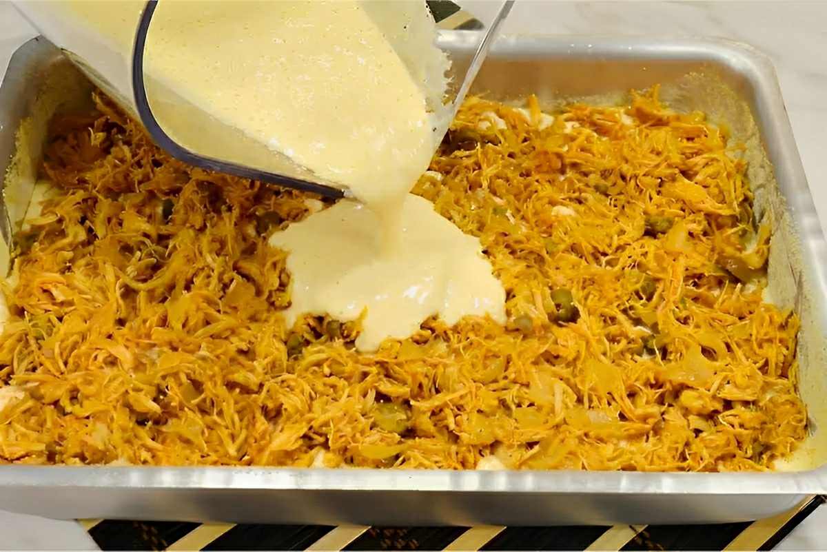 Para a torta de frango de liquidificador, colocaremos no liquidificador: os ovos, o óleo, o sal e o leite, batendo bem por 2 minutos, para incorporar. Juntaremos gradualmente a farinha de trigo, batendo rapidamente a cada adição, para misturar, acrescentando o fermento na última adição e batendo rapidamente. Vamos montar a torta, em uma forma retangular (23cm x 32cm), untada e polvilhada, colocando nela um pouco menos da metade da massa, distribuindo bem. Finalizaremos a receita seguindo corretamente o passo a passo da receita. Depois sirva e aproveite sua sensacional torta de frango de liquidificador!